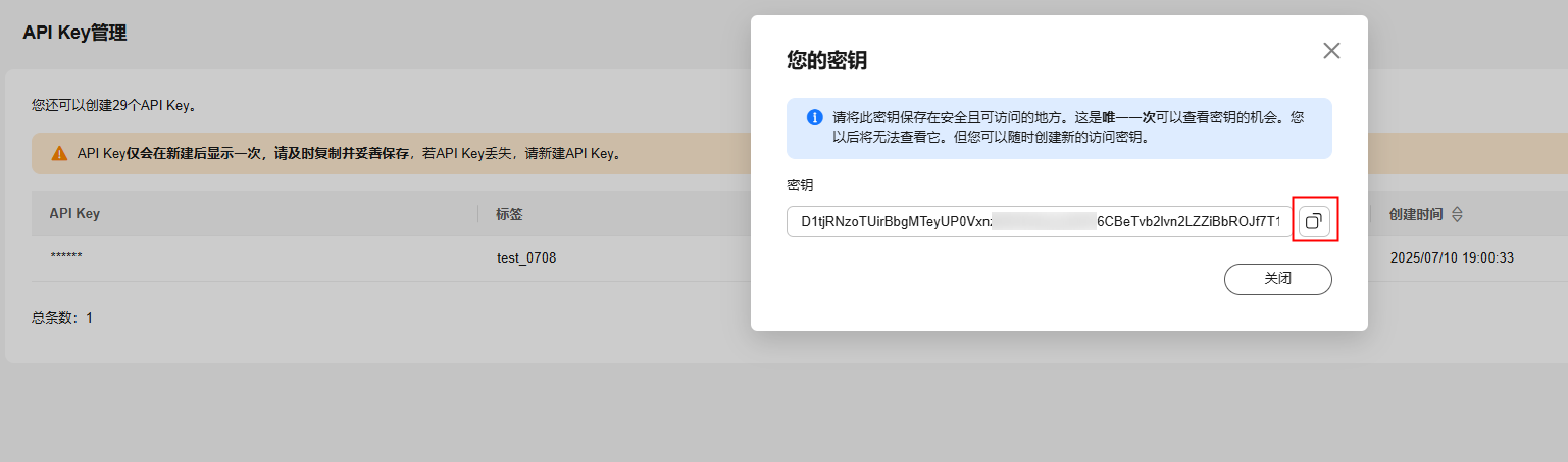 注意保存当前API Key: