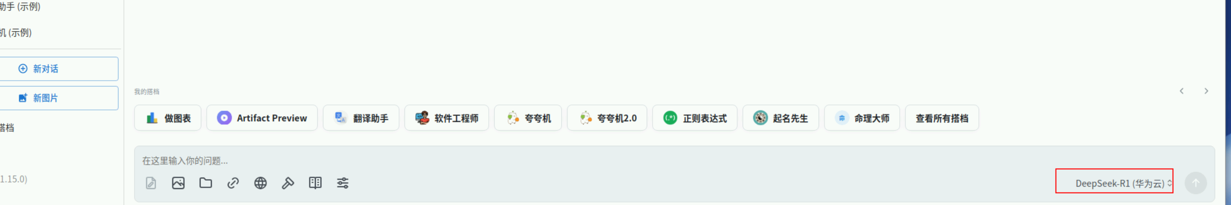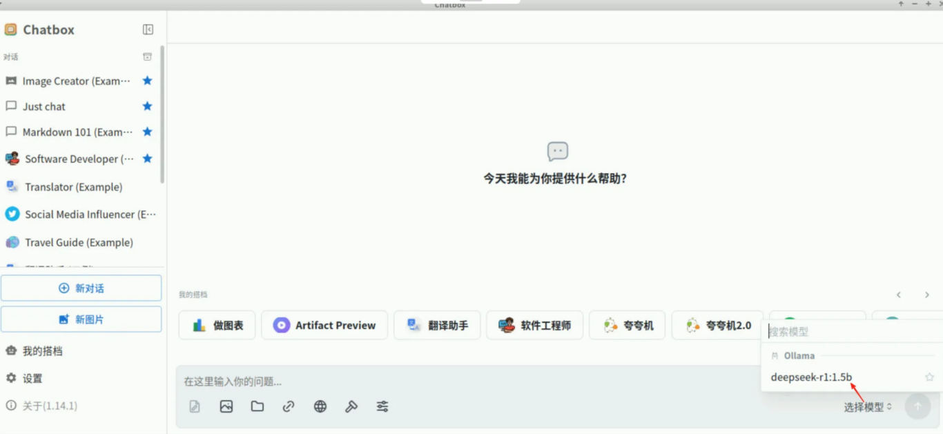 右下角选择模型,选择我们刚添加的deepseek-r:1.5b即可。