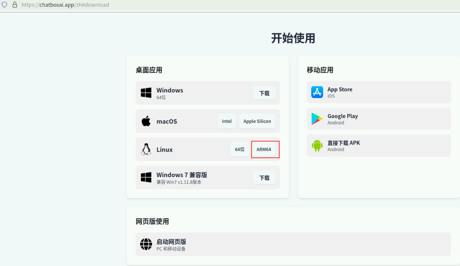 进入云主机桌面,打开火狐浏览器,搜索框中输入 https://chatboxai.app/zh#download,并按下回车,进入ChactBox官网。根据领取云主机的配置选择64位还是ARM64位。