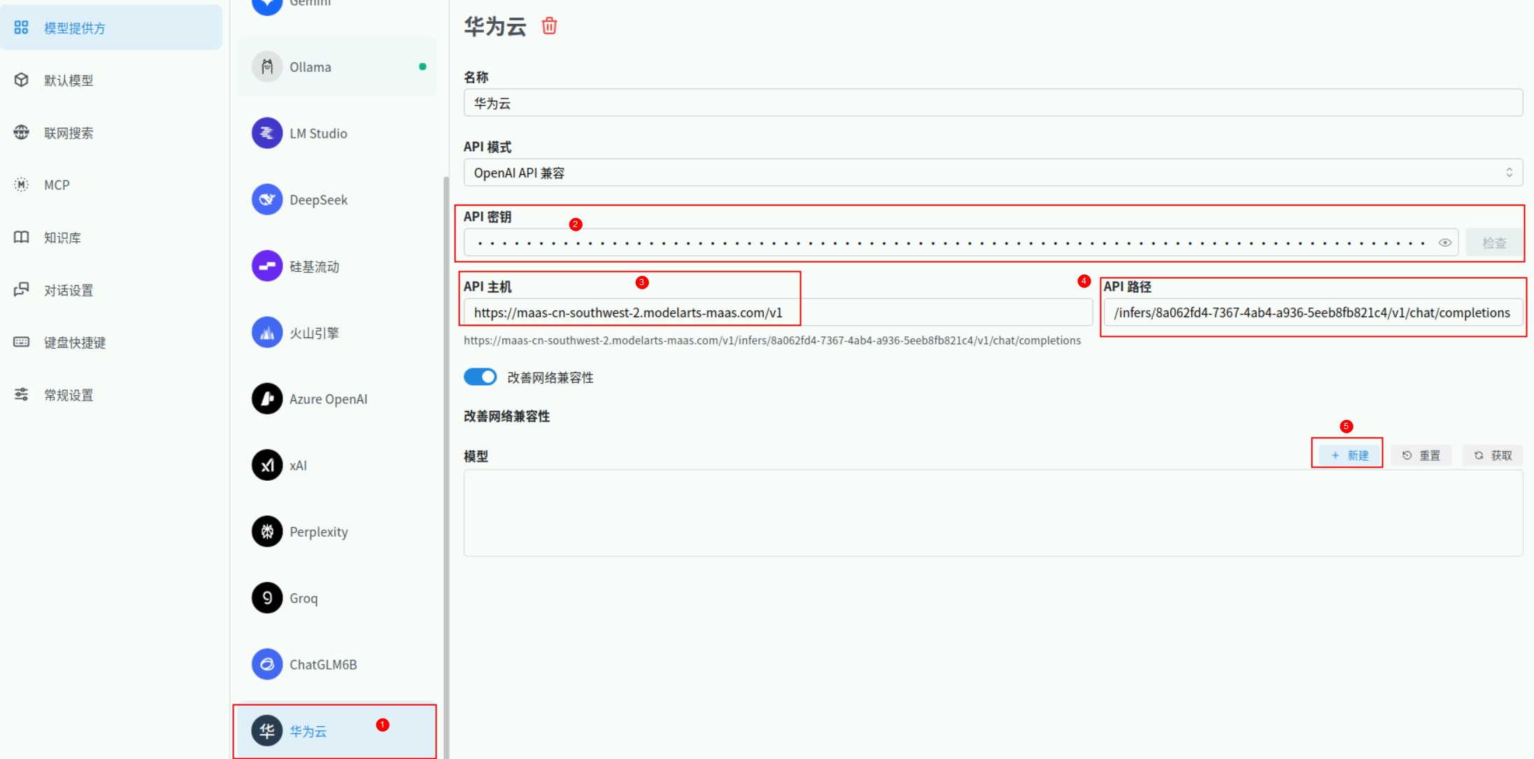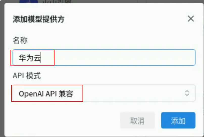 名字输入华为云,API模式选OpenAI API兼容,点击添加按钮。