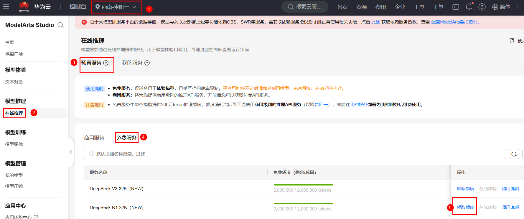 在云主机内,使用火狐浏览器登录MaaS大模型即服务平台区域选择【西南-贵阳一】,在左侧菜单栏,选择【在线推理】 > 【预置服务】 > 【免费服务】,选择【DeepSeek-R1-32K(NEW)】模型,点击【领取额度】,领取200万免费tokens。