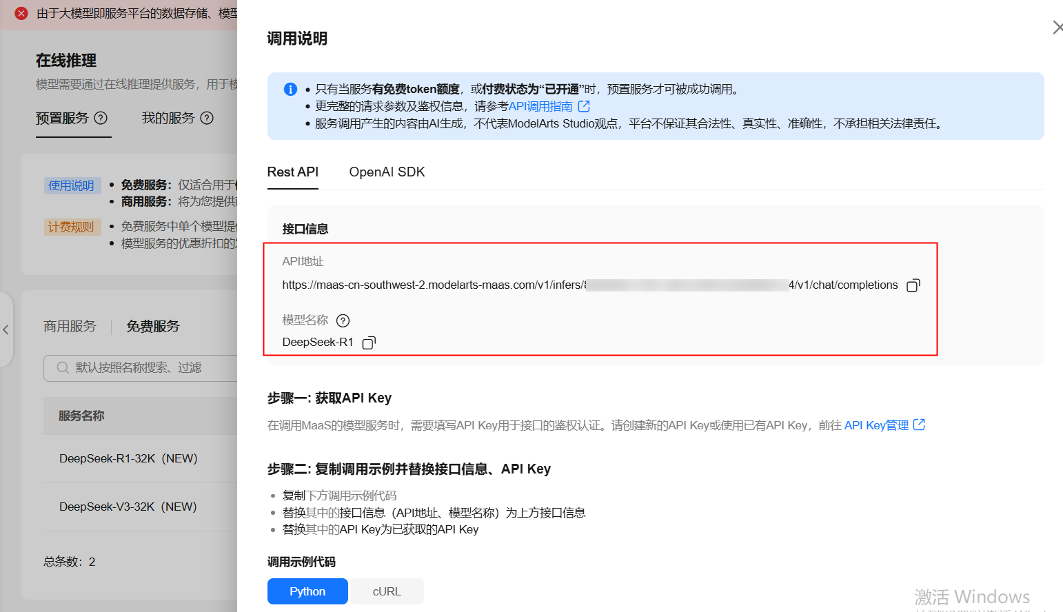 领取完成后,点击对应服务操作栏中的【调用说明】,这里我们可以获取两个关键信息:模型名称和API地址。
