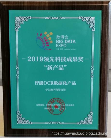 凭借创新性和技术领先型,5月26日,“华为云智能OCR数据化产品”获得了行业权威奖项“2019数博会领先科技成果奖”——新产品奖。