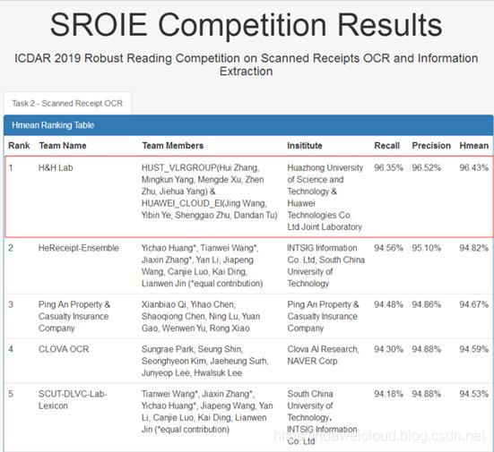 近日,有“OCR领域奥斯卡”之称的ICDAR 2019公布国际票据扫描件文字识别和信息提取(SROIE)大赛结果。华为云与华中科技大学(以下简称“华中大”)组成的智能创新联合实验室团队,在大赛最重要的“发票文本的端到端识别任务”(包含票据文本定位和识别两个关键步骤)中,以96.43%的高精度,夺得世界第一。