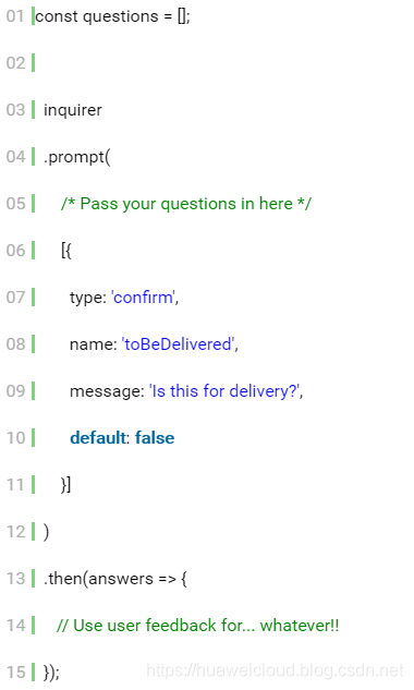 github地址为:Inquirer.js地址 guide风格的命令行,指提问-回答模式的命令行,inquirer.js支持常见的input输入,单选,多选,是/否等常见提问类型,并暴露了增加自定义类型的接口,参考官方文档很容易使用。