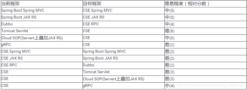 下面表格结合上面的分析,简单的评估了一下各个框架切换CSE的难度对比。这个难易程度只是近似的评估,主要考察可能的改动点多少。工作量的评估的一个很重要要素是原来业务系统本身在处理平台依赖上的成熟度(依赖的多少和程度),这个工作量不再这里评估,尽管这个可能是导致工作量最重要的因素。