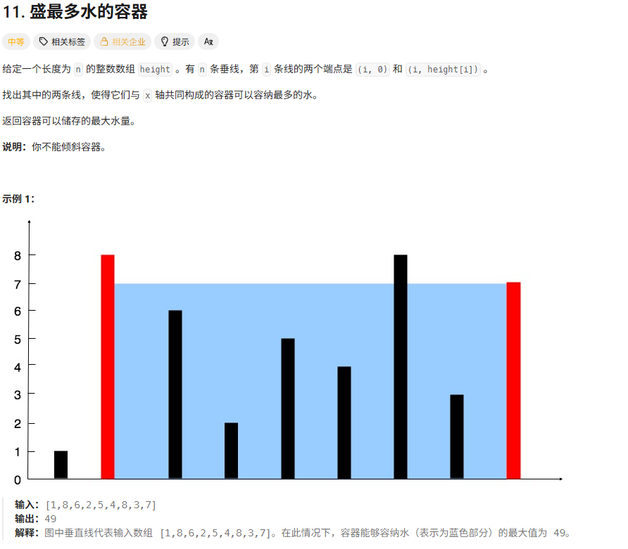 - 为什么两个指针初始化在两边:因为这是最左和最右,而最优情况一定是这两指针之间的两个柱子
