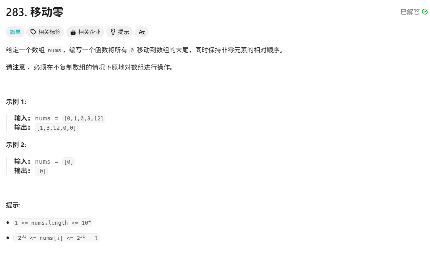 思路(记方法):双指针,右指针找到最近的非零元素,与左边界交换;左指针维护一个左边界(所有零在这个边界上或它右边),每次交换一个非零元素到左边界,左边界右移