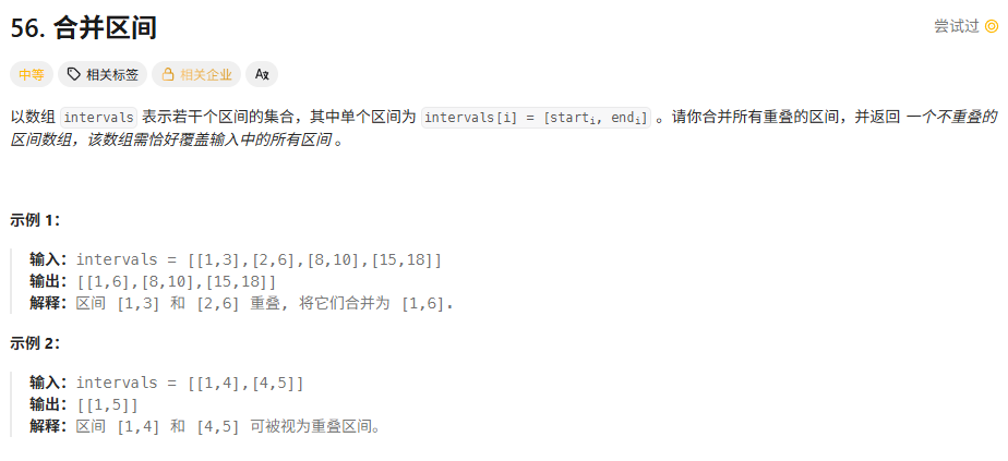 intervals按左端点排序(方便后续遍历与合并) - 先将第一个区间作为待合并区间,遍历数组,比较当前区间的左端点是否在合并区间之间,判断是否合并