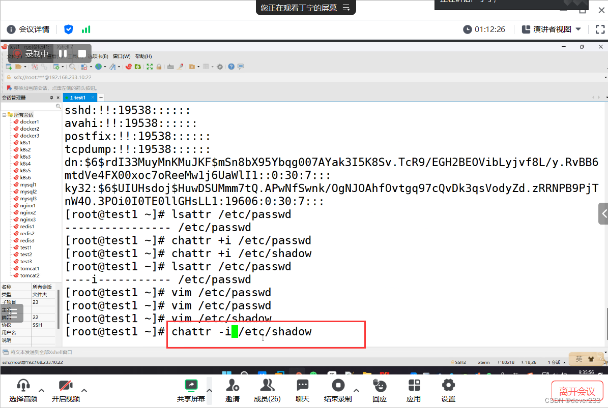 - 锁定重要文件 /etc/passwd /etc/shadow /etc/fatab nginx.conf httpd.conf 重要的配置文件或系统文件 进行锁定 chattr +i 锁定文件 防止误操作
