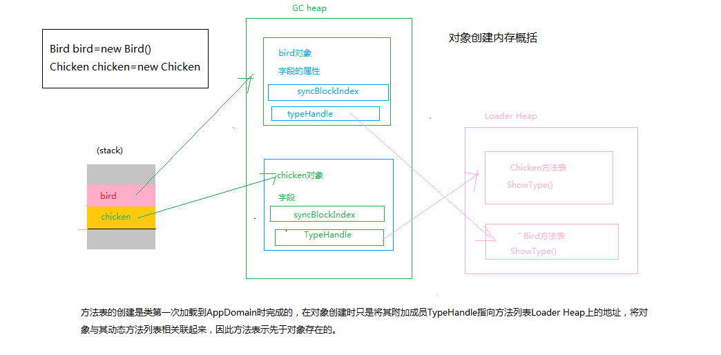 - //2.2方法表的创建是类第一次加载到AppDomain时完成的,在对象创建时只是将其附加成员TypeHandle指向方法列表LoaderHeap上的地址,将对象与其动态方法列表相关联起来,因此方法表示先于对象存在的。