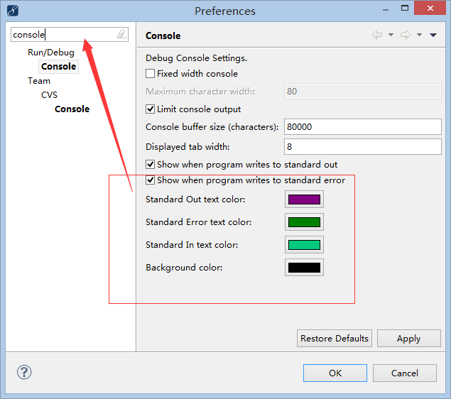 打开windows -> preferences,搜索console。修改下方红框中的部分即可