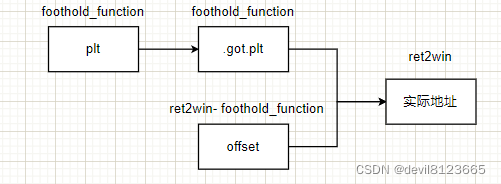 原理,由于plt表与got表的特性,函数第一次调用时plt表指向的got表中存储的执行在plt表中查找函数真实地址的函数地址,查找到函数真实地址后,存储到got表的原来表项中替换掉查找函数的指向地址。以题目为例, foothold_function函数,先调用利用利用plt表中的地址调用一次后,在plot表中会存储其真实地址,利用foothold_function函数与ret2win函数在libpivot32.so的便宜差,通过foothold_function真实地址,计算出ret2win函数的真实地址。