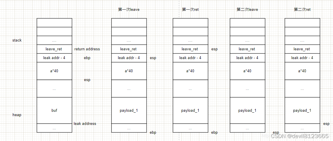 通过填充数据将ebp覆盖成我们想让函数执行流去到的地方(dss/data/堆区) 然后在填入leave_ret 指令 特别注意的是:其实在函数执行到我们填入的leave_ret指令之前,函数内自己也有一段leave_ret 指令,也就是说,我们这个设置栈溢出,leave_ret 指令它执行了两次。 实际上,这里执行了两次的leave_ret过程。第一次函数运行结束后,进行leave的时候,会把ebp丢到堆空间的地方。然后利用第一次ret跳转到leave_ret的gadget的地方再执行一次leave_ret,从而将esp也弄到堆空间的payload_1处。由于每次ret都会使得esp+4,所以,伪造的ebp的地址要减去4。