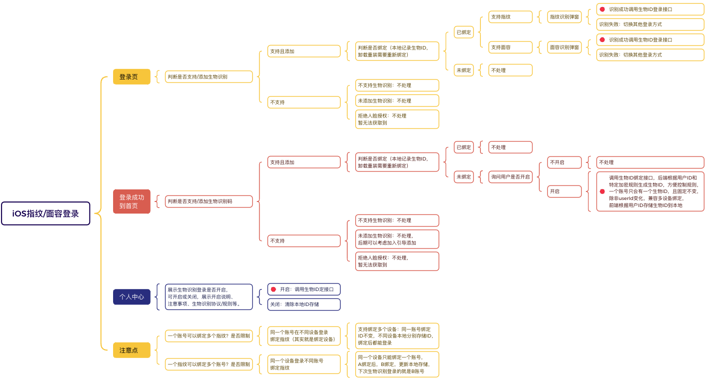 基于简单简洁的原则,我们仅在用户登录完成后才提示用户用户绑定指纹/面容登录,提示前需要先判断设备是否支持指纹/面容识别且录入了对应信息,支持且录入则判断是否绑定过,未绑定才提示绑定,点击绑定直接调用后端绑定接口获取绑定ID,,存储到本地,标记为已绑定(这里不要求验证指纹/面容后才能绑定,也是为了简化用户操作,减少敏感度)。下次登录时优先弹出指纹/面容登录界面,识别后将本地存储的绑定ID传给后端获取用户信息完成登录。