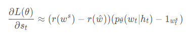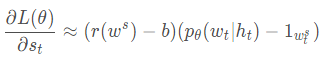 公式的意思就是:对于如果当前sample到的词比测试阶段生成的词好,那么在这次词的维度上,整个式子的值就是负的(因为等式右边一定为负),这样梯度就会上升,从而提高这个词的分数,而对于其他词,等式右边一定为正,梯度就会下降,从而降低其他词的分数。