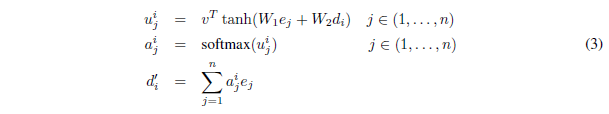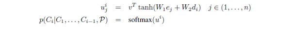 根据传统的注意力机制,作者想到,所谓的正是针对输入序列的权重,完全可以把它拿出来作为指向输入序列的指针,在每次预测一个元素的时候找到输入序列中权重最大的那个元素不就好了嘛!于是作者就按照这个思路对传统注意力机制进行了修改和简化,公式变成了这个样子: