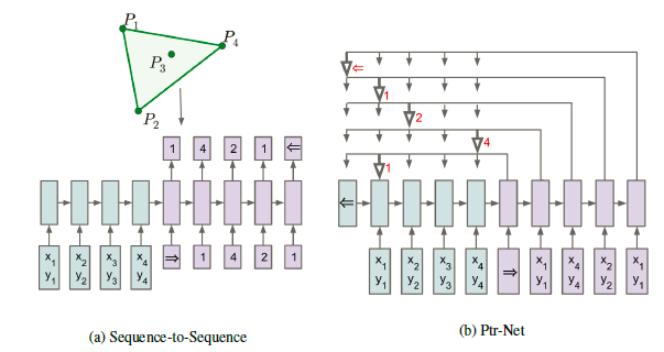 这个图的例子是给定p1到p4四个二维点的坐标,要求找到一个凸包。显然答案是p1->p4->p2->p1。图a是传统seq2seq模型的做法,就是把四个点的坐标作为输入序列输入进去,然后提供一个词汇表:[start, 1, 2, 3, 4, end],最后依据词汇表预测出序列[start, 1, 4, 2, 1, end],缺点作者也提到过了,对于图a的传统seq2seq模型来说,它的输出词汇表已经限定,当输入序列的长度变化的时候(如变为10个点)它根本无法预测大于4的数字。图b是作者提出的Pointer Networks,它预测的时候每一步都找当前输入序列中权重最大的那个元素,而由于输出序列完全来自输入序列,它可以适应输入序列的长度变化。