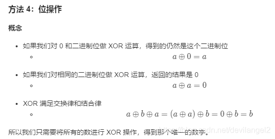 给定一个非空整数数组,除了某个元素只出现一次以外,其余每个元素均出现两次。找出那个只出现了一次的元素。(简单)