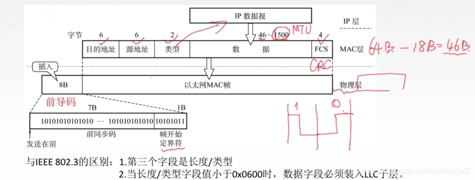 为什么会有前导码,因为一个站开始接收数据帧的时候,由于适配器的时钟尚未与到达的比特流达成同步,前面的若干字节就无法接收。帧开始定界符后面的两个11就是提示开始接收MAC帧。