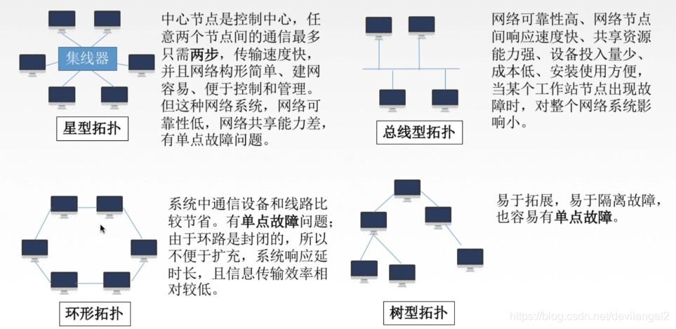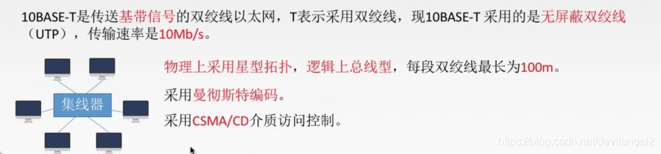1.以太网:以太网是应用最为广泛的局域网,包括标准以太网(10Mbps) 、快速以太网(100Mbps) 、 千兆以太网( 1000 Mbps)和10G以太网,它们都符合IEEE802.3系列标准规范。逻辑拓扑总线型,物理拓扑是星型或拓展星型。使用CSMA/CD.