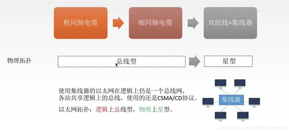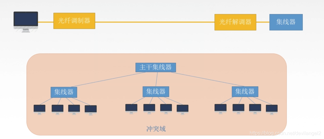 电信号转换为光信号,光信号在转换电信号。光纤带来的时延很小,带宽很宽。如上图,三个独立的碰撞域可以通过主干集线器连接起来,形成更大的以太网。可以跨冲突域通信并且扩大了以太网的覆盖范围。但是也有缺点:
