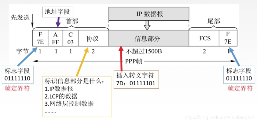 PPP的首部为4个字段,尾部为2个字段。A、C字段至今也没给出定义,两个字段实际上没有携带PPP帧信息。