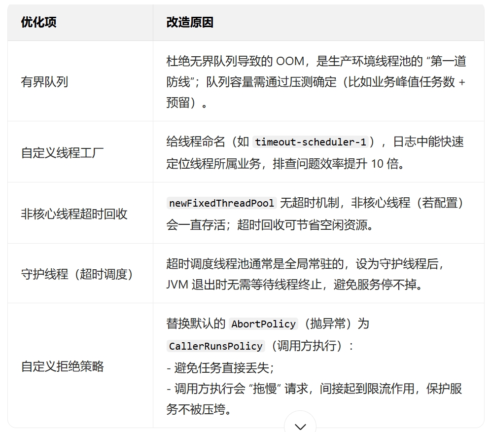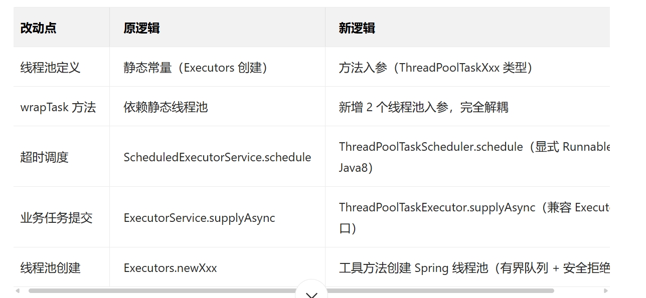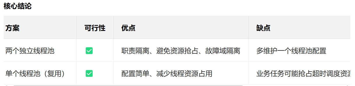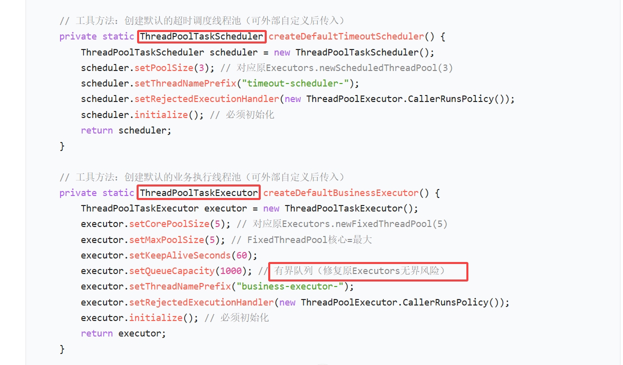 5.两个线程池隔离分开(全局调度线程池和业务执行线程池),而非共用一个线程池,且用@Autowaired注入类中,通过方法参数传递进去,注意ThreadPoolTaskExecutor 是 Spring 框架(spring-context 模块)提供的线程池实现