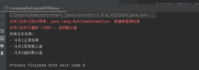 CompletableFuture<String> future3 = wrapTask(task3, "任务3", "任务3超时默认值", "任务3异常默认值");