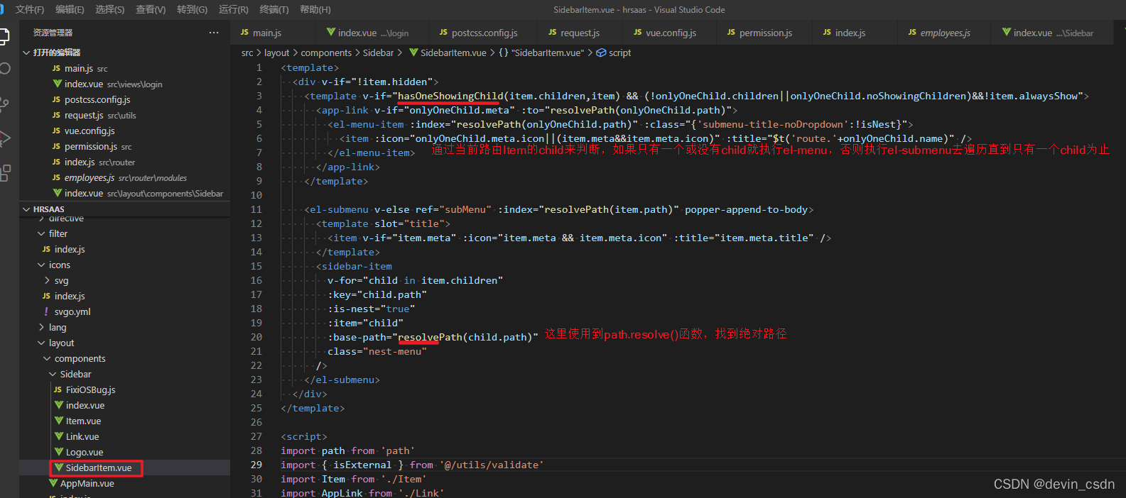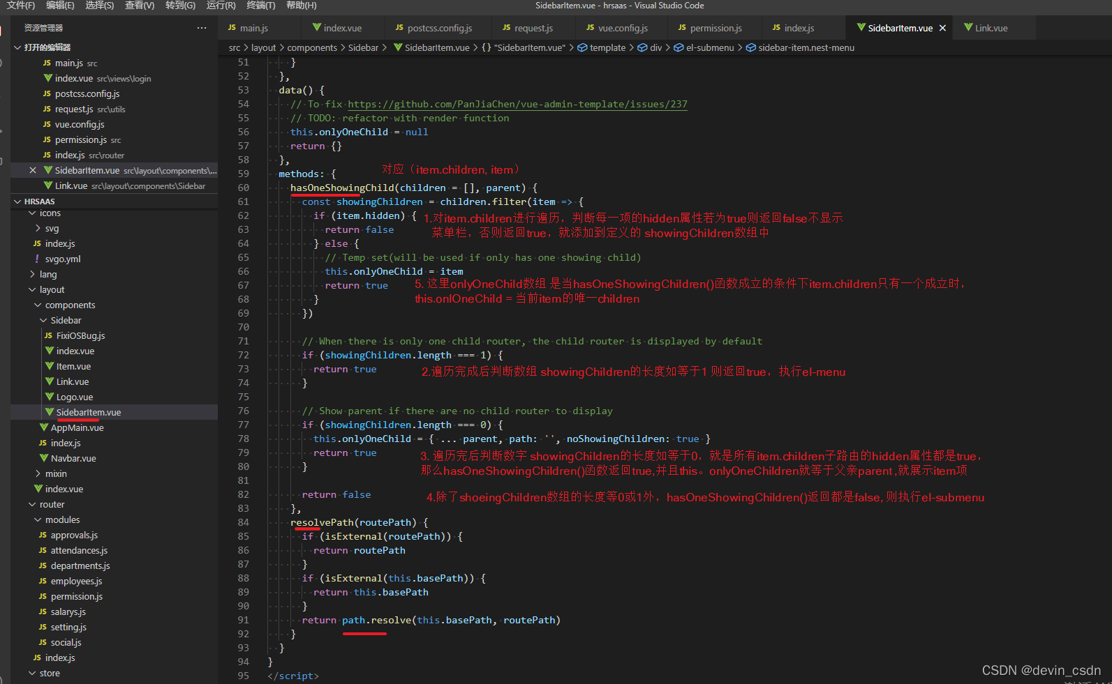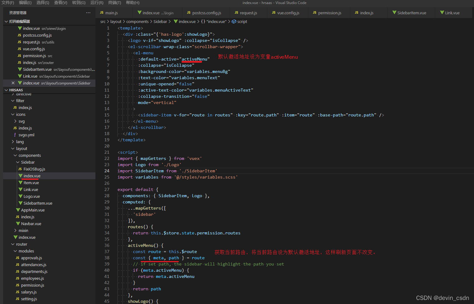 sidebar文件下的index.vue就是侧边栏的架构,主要是有<el-menu><el-menu/>组成;el-menu里面是通过SidebarItem来完成路由菜单。