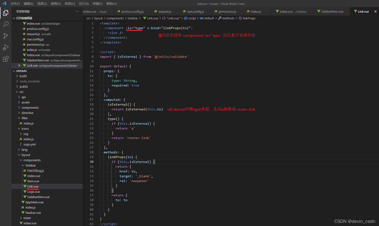 4.在<app-lin><app-link/>组件中isExternal()是校验函数,当校验地址path为‘http//...’返回true,则动态切换组件为a链接;否则返回的是<router-link>,并执行 :to传过来的path;