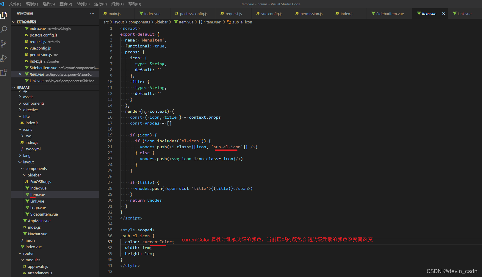 如图sub-el-icon { color : currentColor } 表示图标色颜色是继承父级或相关联颜色,这个属性极其好用。但是原框架的中svg图标好像没有对应的css代码,我们可以在svg的fill 添加currentColor属性。一般在UI给我们切图的时候,可以跟UI说svg的fill属性值设为currentColor,这样和icon图标的sub-el-icon是同样的效果。