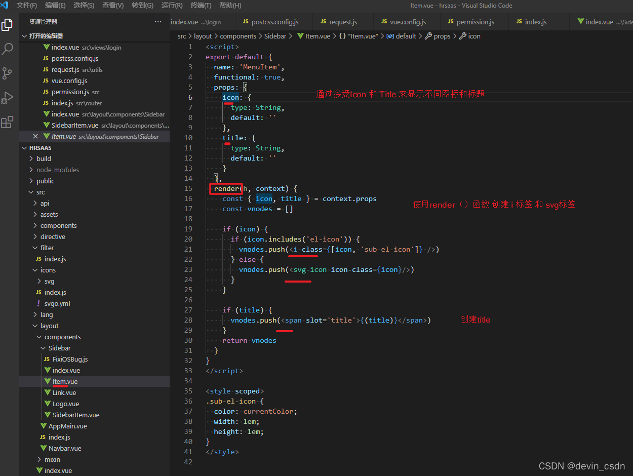 并且 这里使用到了render()函数,创建 i 标签和 svg标签。所以在侧边栏中,是可以使用Icon图标和svg图标,然后就是创建了span标签展示对应的title