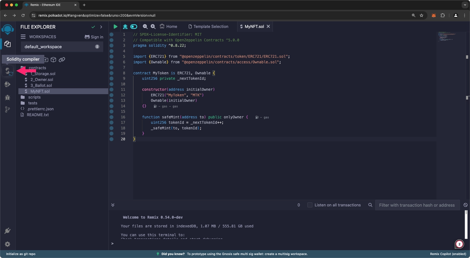 本教程将指导你如何使用 Polkadot Remix IDE(一个基于 Web 的开发环境),在 Polkadot Hub 测试网 上部署一个 ERC-721 NFT 合约。为确保安全性与标准兼容性,示例合约基于 OpenZeppelin 提供的 NFT 合约实现。