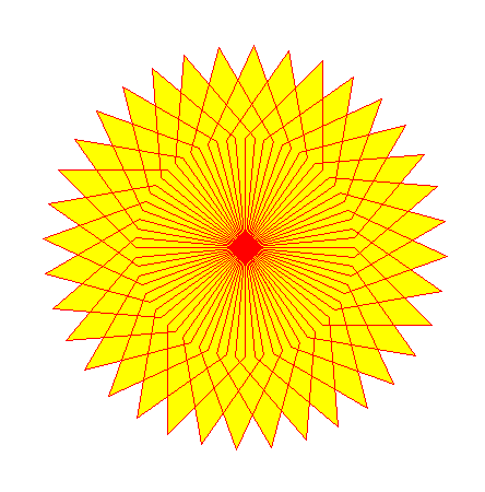 import turtle turtle.speed(10) turtle.fillcolor("yellow") turtle.pencolor("red") turtle.begin_fill() def my_draw(): for i in range(1,3): turtle.forward(100) turtle.right(45) turtle.forward(100) turtle.right(135) for i in range(1,40): my_draw() turtle.right(10) turtle.end_fill() turtle.right(30) turtle.forward(50) turtle.hideturtle()