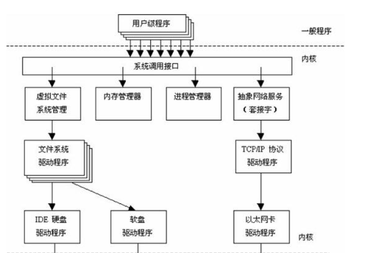 Linux 内核由如下几部分组成:内存管理、进程管理、设备驱动程序、文件系统和网络管理等。如图: