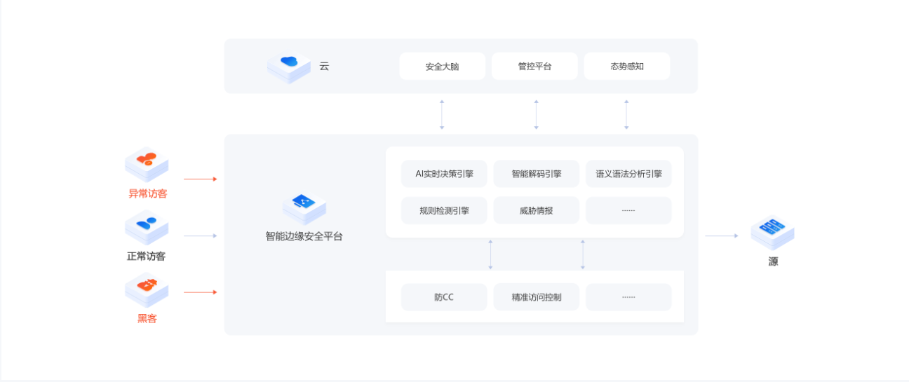 基于应用层CC攻击智能识别算法防御引擎,结合内核防火墙、IP信誉库、设备指纹库、行为式验 证码等秒级拦截CC攻击,支持自定义匹配条件,为不同业务场景定制专有防护策略,精准、灵活 控制请求访问。