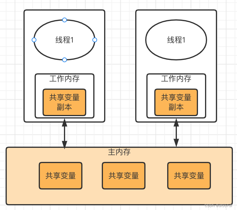 Java内存模型规定所有的变量都是存在主存当中(类似于前面说的物理内存),每个线程都有自己的工作内存(类似于前面的高速缓存)。线程对变量的所有操作都必须在工作内存中进行,而不能直接对主存进行操作。并且每个线程不能访问其他线程的工作内存。