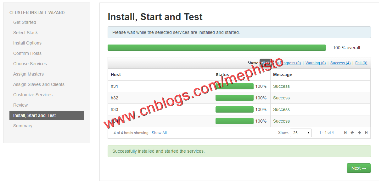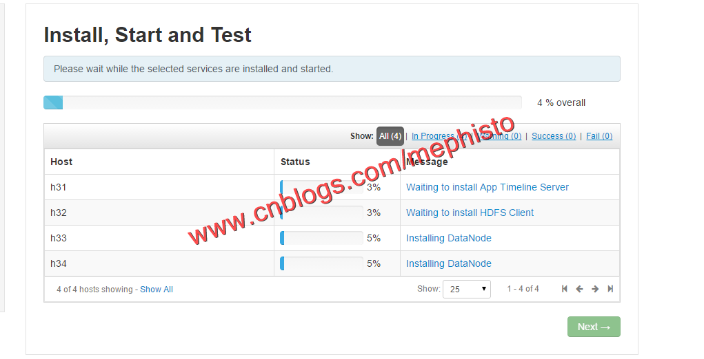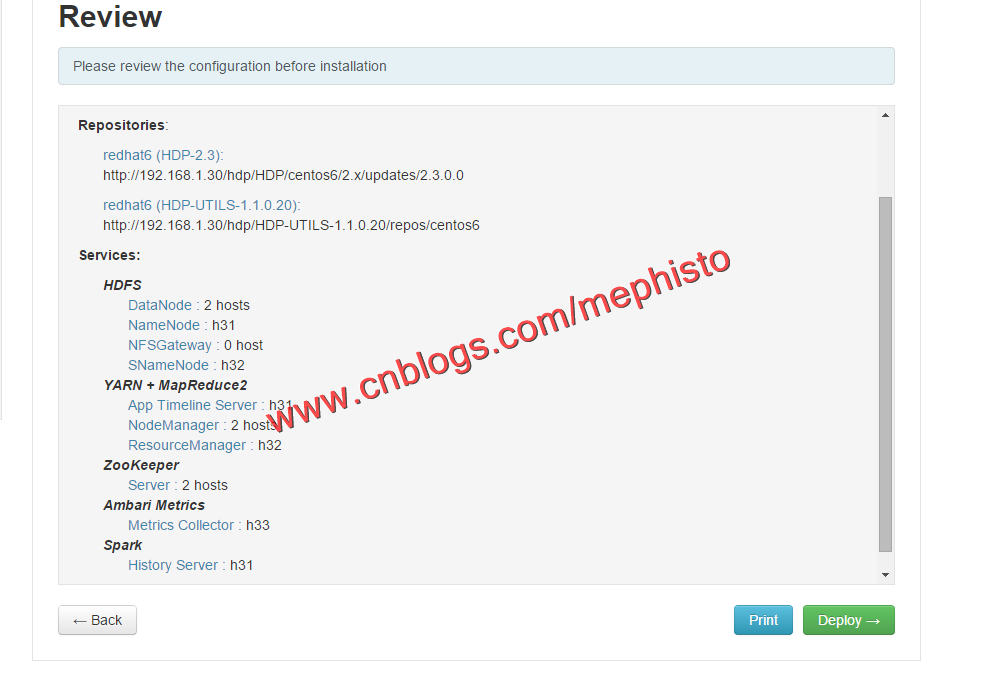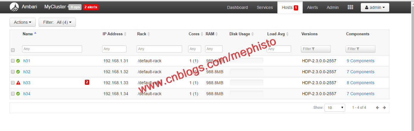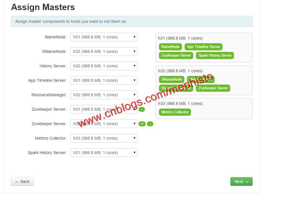 这里我们选择了事前准备好的H31,H32,H33这3台机器,由于本机的性能一般,很快内存,IO就占满了,所以没有使用很多的机器做集群。