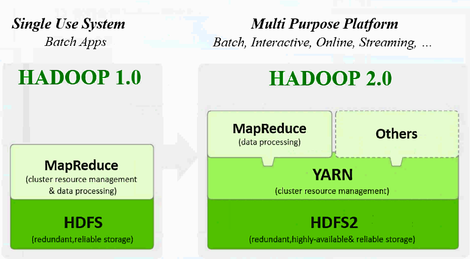 从图中,我们可以看到Hadoop1.x是单一功能使用系统,Hadoop2.x是多用途平台。2.x开始,hadoop的功能增强了许多,可以适合很多地方。
