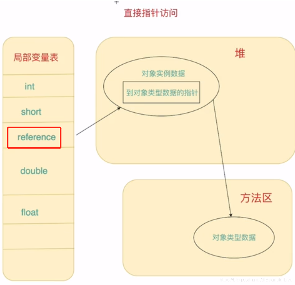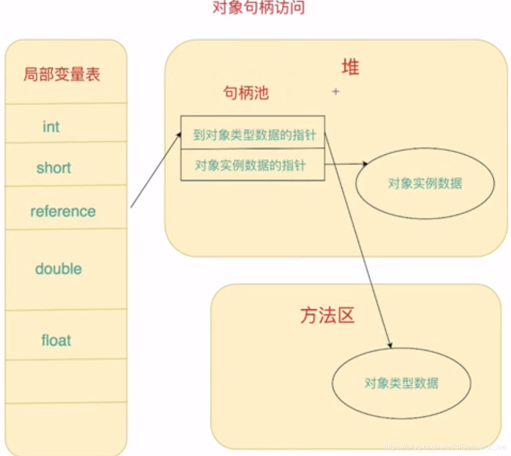 1.使用句柄访问对象:java堆中就会划分一块内存来作为句柄池,reference中存储的就是对象的句柄地址,而句柄中包含了对象实例数据和对象类型数据各自的具体地址信息。
