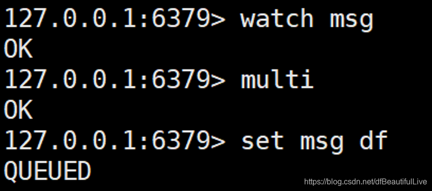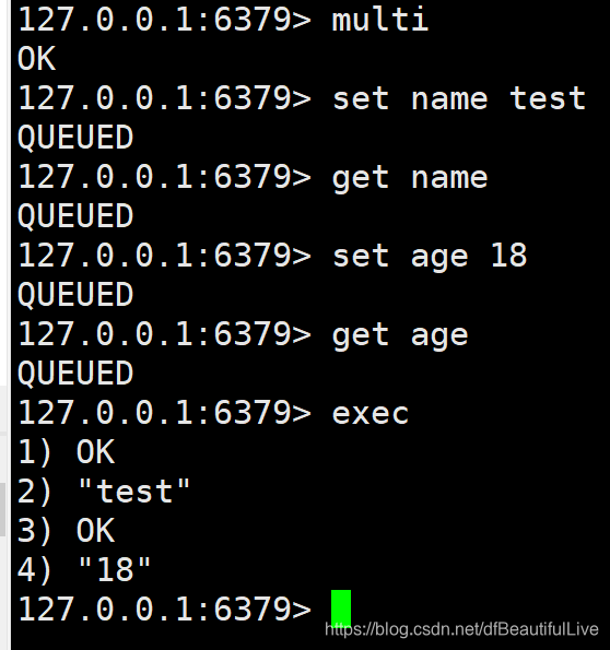 1.2.2 如果不是,命令就进入队列等待执行,返回QUERY命令进入队列,直到输入EXEC,返回事务处理中所有命令结果。