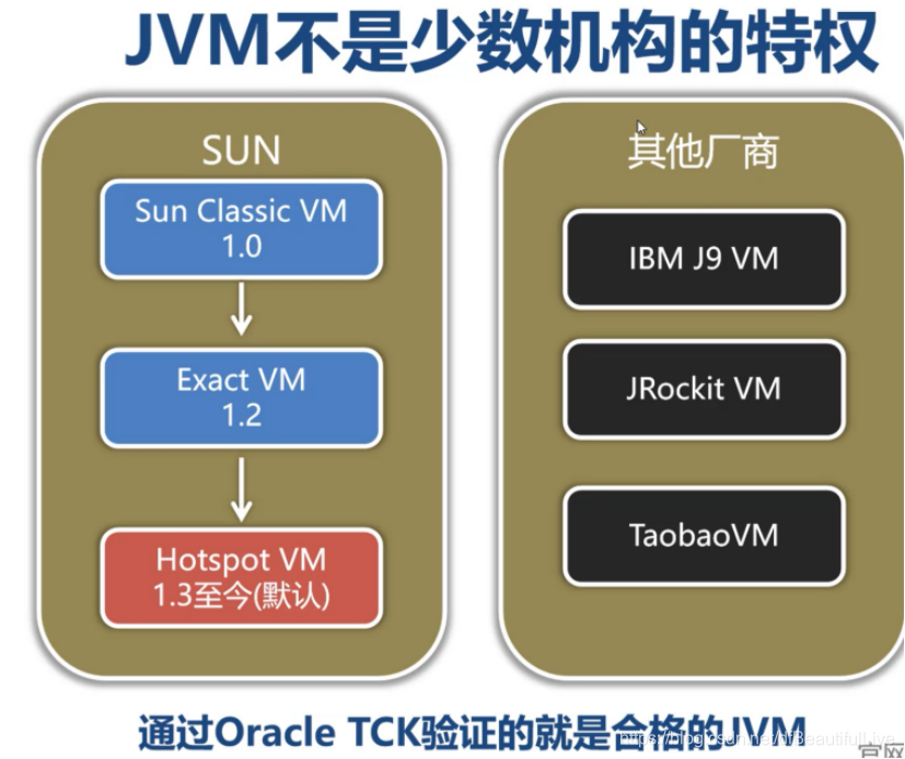 其实很多厂商都会做自己产品的jvm,但是通过TCK验证(就是专业的测试用例)才能是合格的jvm,咱们目前使用的一般都是Hotspot vm