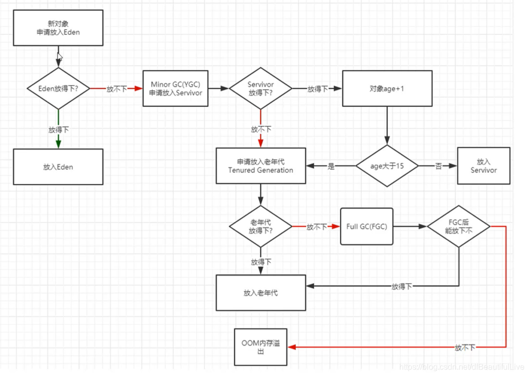 - 能够放下,那对象age+1,判断age对象数量>15就放入老年代,小于放入Servivor