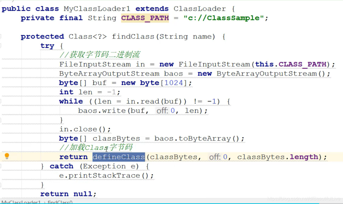咱们打开测试类,通过new对两个类加载器进行实例化c1、c2,调用loadClass(“ClassSample”)后就会找到对应实例的findClass()
