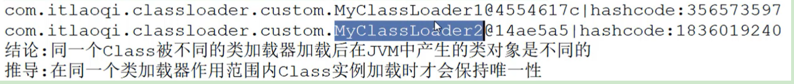 运行后发现两个类加载器完全不同,一个用MyClassLoader1,一个是MyClassLoader2,它们的hashCode也不同,代表不是一个实例,由此得出以下结论。