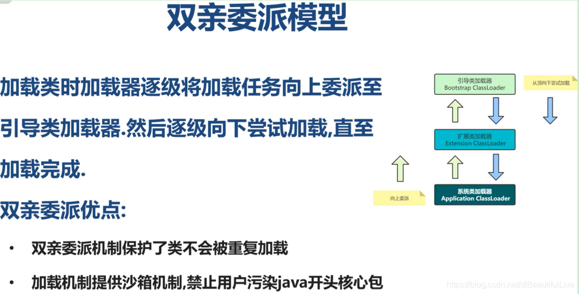 双亲委派就是:假如我自己自定义了一个类需要加载,此时通知系统类加载器,但是系统类加载器并不会加载因为它有上级,然后扩展类还有上级就是引导类加载器,相当于一直委派到引导类加载器,然后下一阶段就是依次加载了,引导类加载器加载的是java基本类库,所以加载不了我们自定义的类,再像下找就是扩展类加载器,扩展类是加载扩展类下的包,也加载不了自定义的,再向下找加载,找到了系统类加载器,是可以加载到我们自定义的类的。