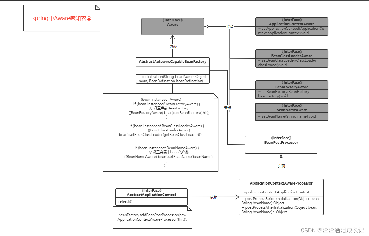 定义了Aware接口,这个接口就是标记的,如果任何继承此接口则代表是感知接口,统一判断对象是不是Aware条件也可使用