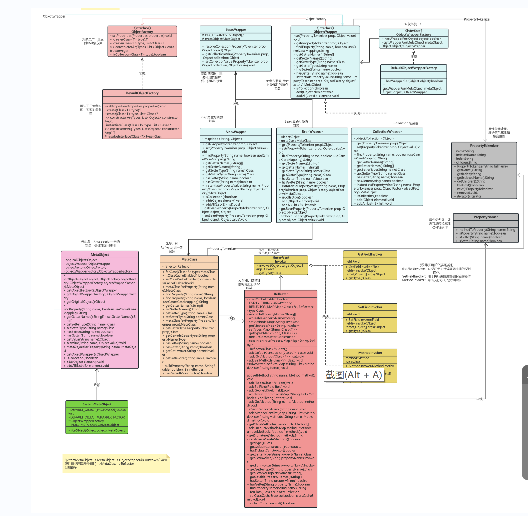 MetaObject:元对象,外部系统调用入口,封装了包装器对象,在构造方法中使用策略模式来调用不同的对象包装器
