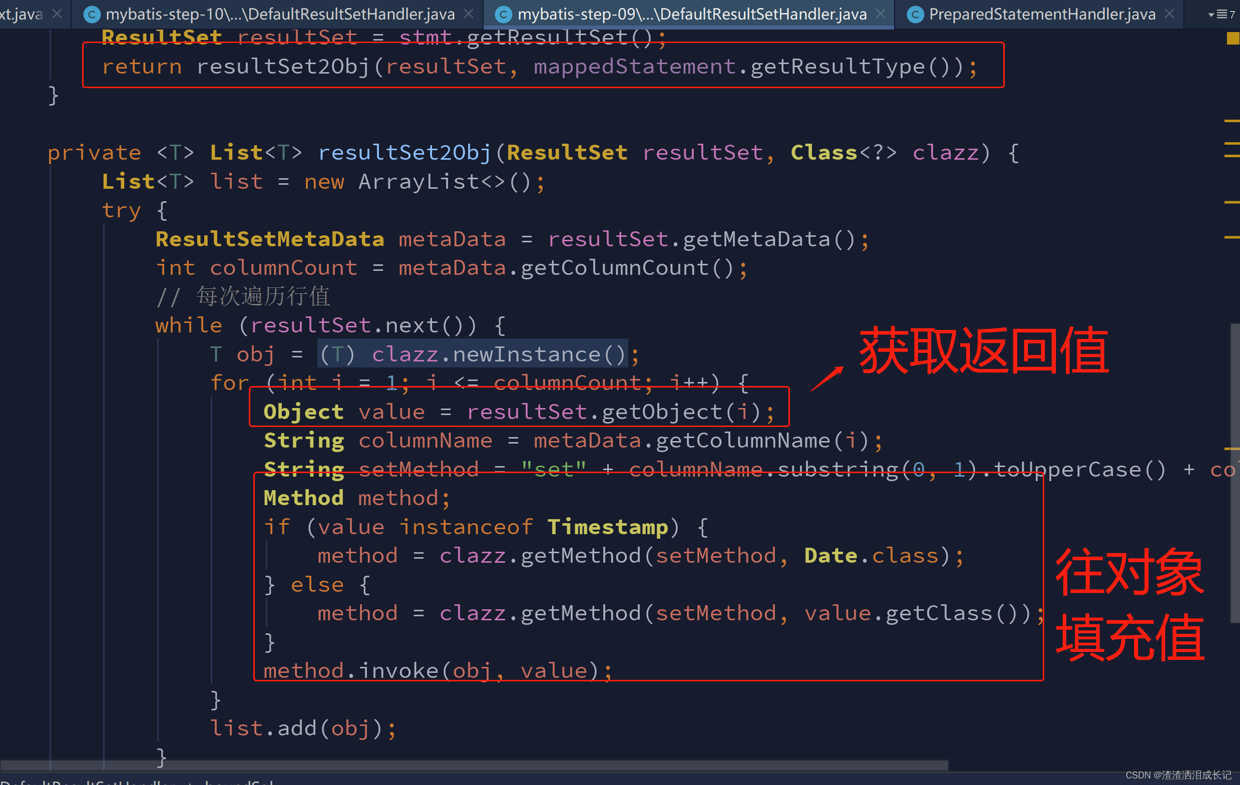 上节我们处理了参数处理器,本节我们处理结果集处理器,之前我们写了一个DefaultResultSetHandler,我们把返回结果获取对象,填充值什么的写到了一起,流程没有进行解耦,并且只接收了Object的对象值类型,需要多元化,所以本节也要解决按返回类型从结果集中获取对应的结果类型值。